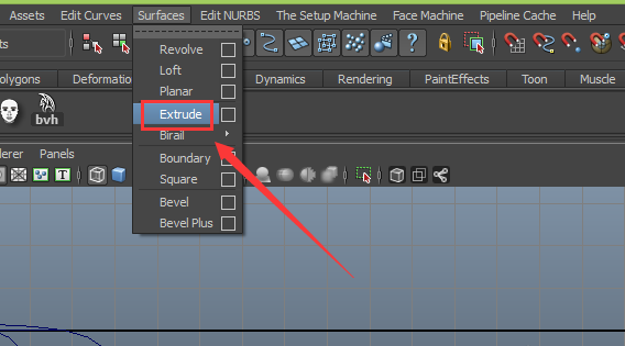 18、选择调节好的圆形,在按下shift键加选曲线,在菜单那里找到surfaces菜单,点击surfaces菜单,在其子级菜单里找到extrude命令,如图所示: