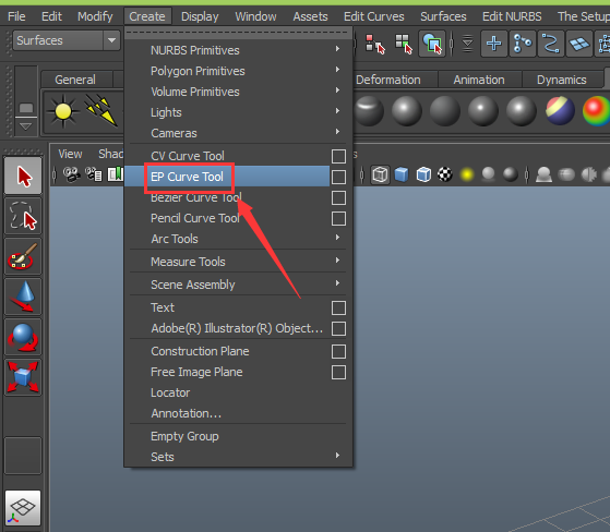 2、在该界面内找到create菜单里的EP curve tool选项,如图所示: