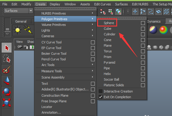 4、再找到create菜单里的polygon primitives选项里的sphere选项,如图所示: