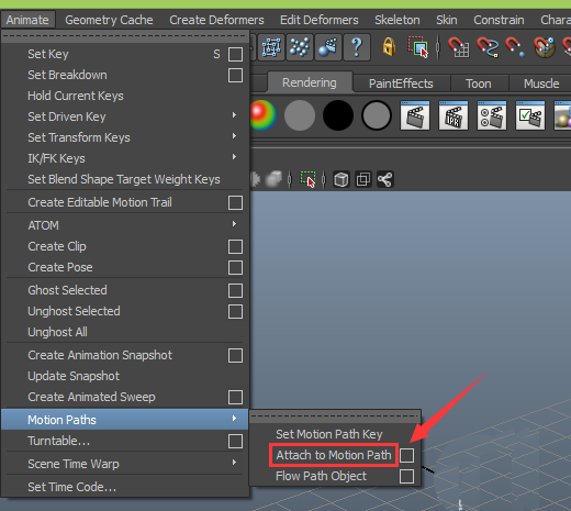 5、点击sphere选项,在在透视图里创建一个球体,选择曲线按下shift键在animate菜单里找到motion paths选项里的attach to motion path选项,如图所示: