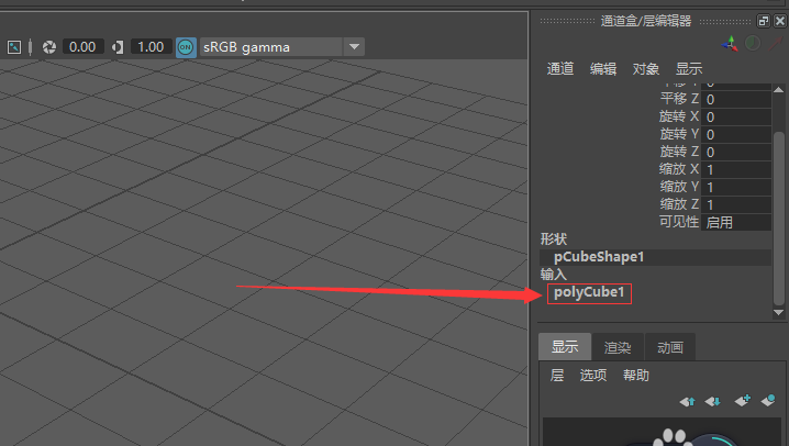 5、点击它之后,我们看右边有一个通道盒,用鼠标移动到下面的polycube1.