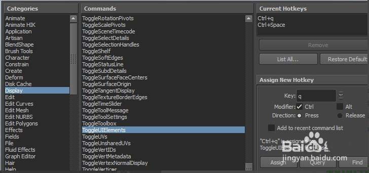 在hotkey sditor窗口里,在categories中选择display。在右边的commands中选择toggleUIElments。然后再右边assign new hotkey下面设置自己需要的快捷键,用query按钮检测设置的快捷键是否有被利用到,没有被利用的话点击assign就可以。