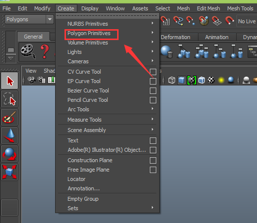 2、在该界面内找到create菜单,点击create菜单在其子级菜单里找到polygons primitives选项,如图所示: