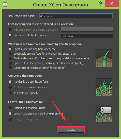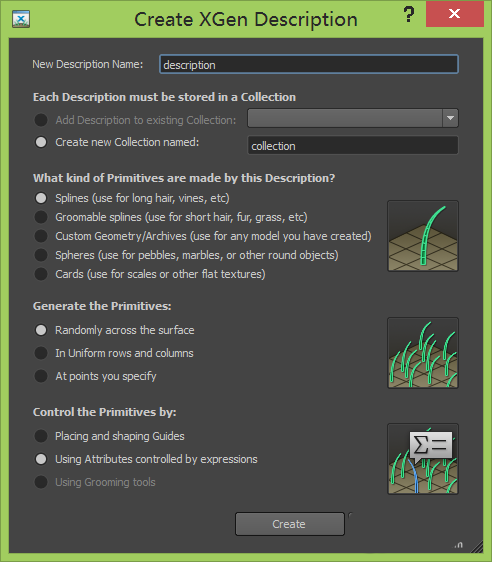 5、点击xgen选项,在其内选择create xgen description选项,点击create xgen description弹出其对话框,如图所示: