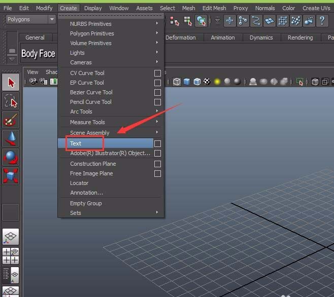 3、点击create选项,在其子级菜单里找到text选项,如图所示: