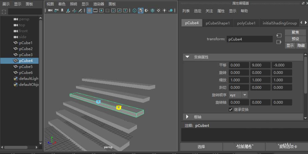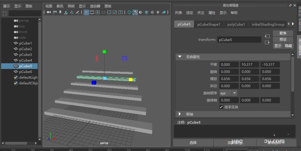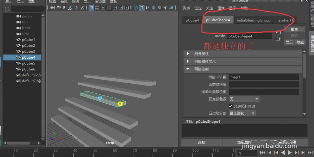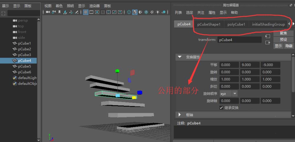 4、首先我们尝试按照实例的方式复制。我们点选复制后的物体,在属性编辑器中,我们看到它们除了最后一个变换属性是各自不同的,前面的pCubeShape1/polyCube1等等属性,包括网格模型,材质等,都是公用的。