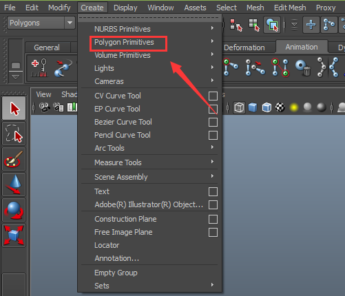 2、在该界面内扎到create菜单,点击create菜单,在其子级菜单里找到polygon primitives选项,如图所示: