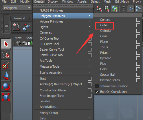 3、点击polygon primitives选项,在其内找到cube选项,如图所示: