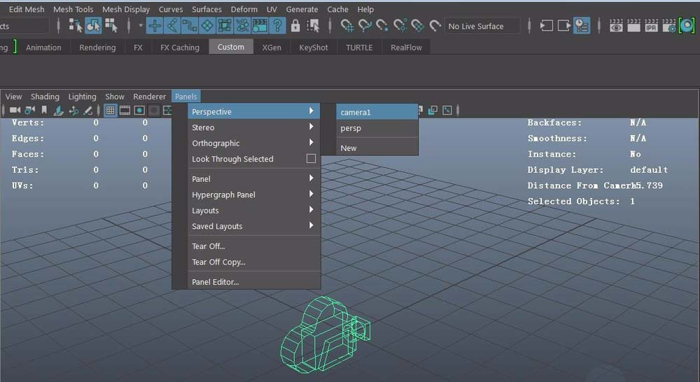 3、进入摄像机视图:选中摄像机--panels---perspective----camera1