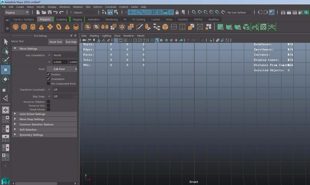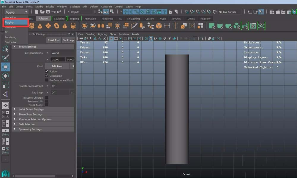 3、进入前视图,然后将面板切换为rigging