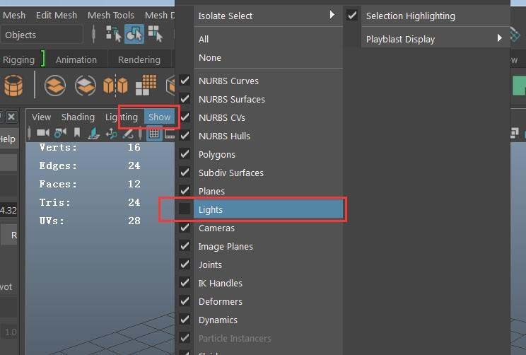 4、也可以在show里面取消light的选择,这样所有的灯光就会全部消失(注意这里只是看不到,但是作用还是有的);可以用此方法只显示light然后框选就可以全部选中了。