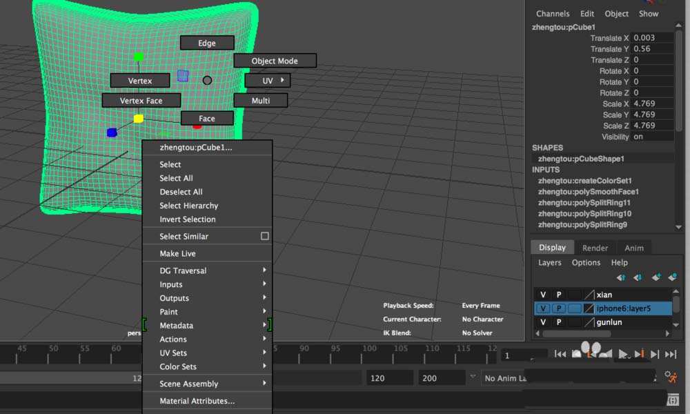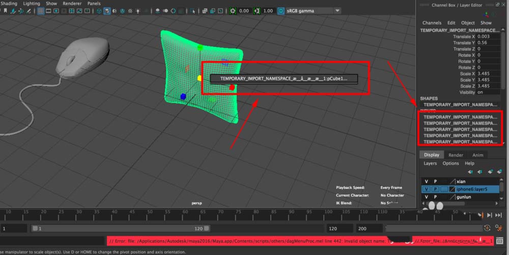 4、此时选择“方形抱枕”模型,点击右键,会发现页面下方的Mel行报错,右侧属性栏显示“TEMPORARY_IMPORT_NAMESPACE_?__?__?__?__1:pCubeShape1”,表示该模型的命名出现了问题。