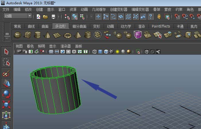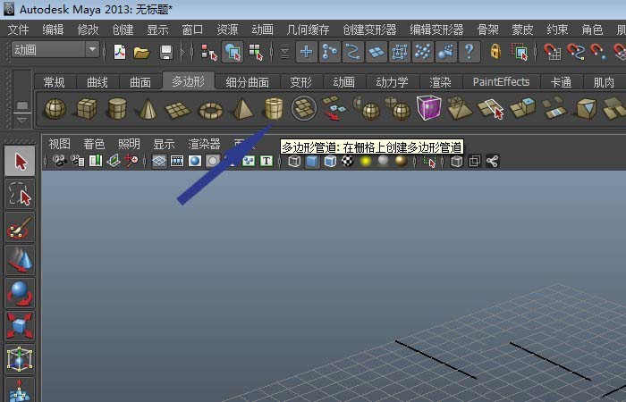 1、打开Maya软件后,这里用的是2013版,在菜单工具栏中,鼠标左键单击【多边形】下的圆环体图形,如下图所示。