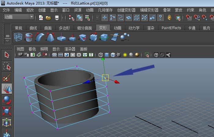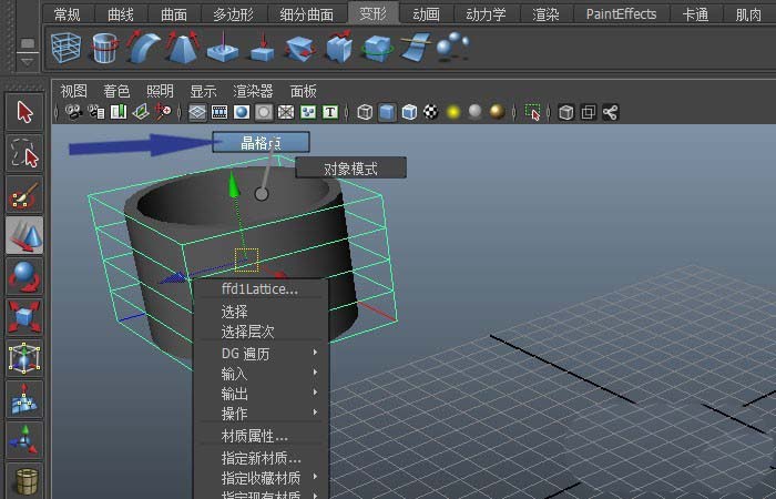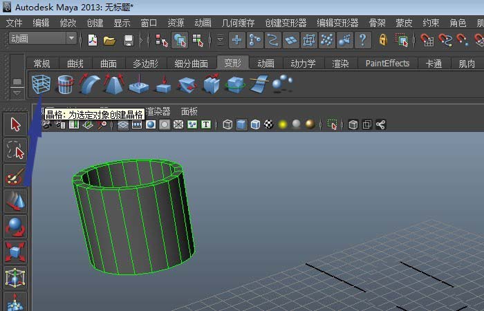3、然后,鼠标左键单击【工具栏】中的【变形】按钮,并选择【创建晶格】按钮,如下图所示。