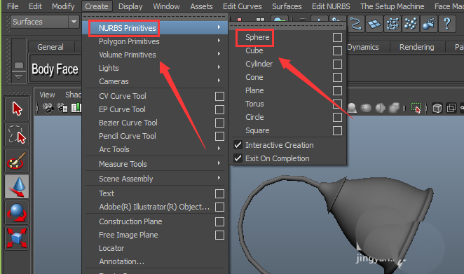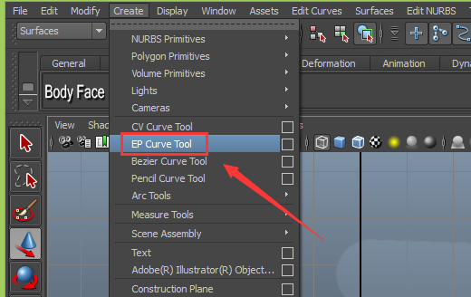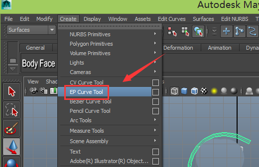 2、在该界面内找到create菜单,在create菜单的子级菜单里找到EP curve tool命令,如图所示: