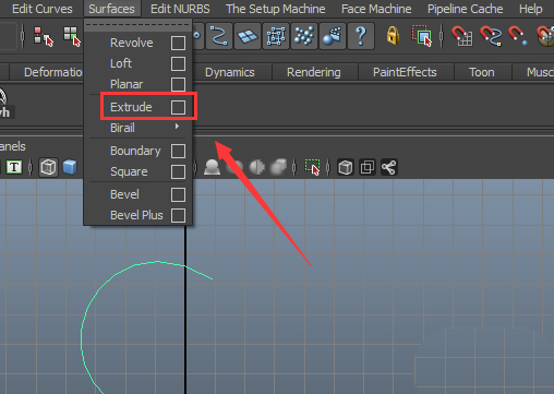 12、选择圆形按下shift键加选调整好的曲线,在surfaces的子级菜单里找到extrude选项,如图所示: