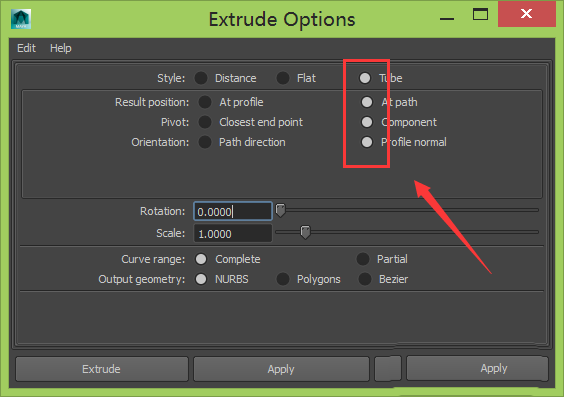 13、点击extrude选项,弹出其编辑界面,在该界面内设置参数,参数设置如图所示:
