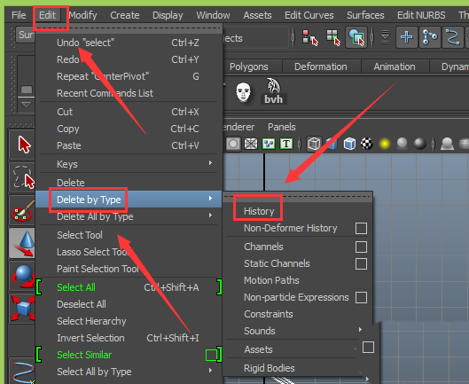 20、在菜单里找到edit菜单,点击edit菜单在其子级菜单里找到delete by type选项,在delete by type的下拉菜单里找到history选项,如图所示: