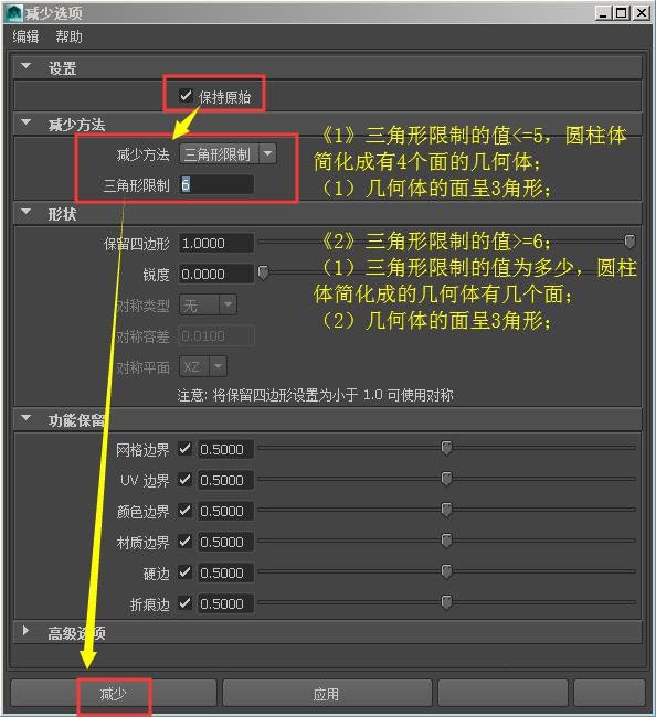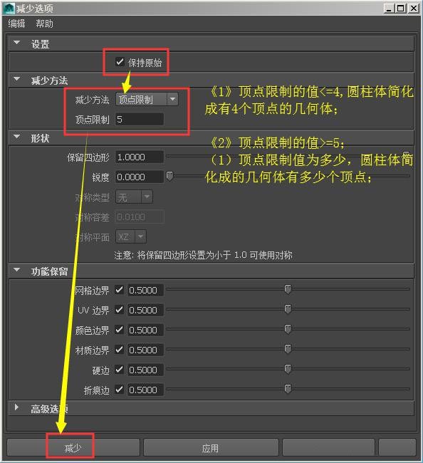 1、“减少”命令,(在“多边形模块——网格”);主要作用是减少模型上的面,简化模型;如图所示: