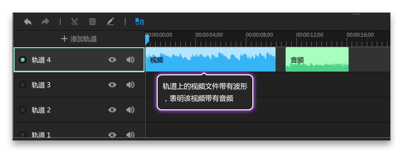 1、观察轨道上的视频、音频文件,可以看到轨道上的视频文件,和音频文件一样带有波形,表明该视频带有音频,如图1所示。