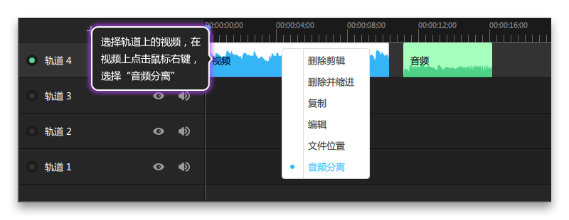 2、选择轨道上的视频,在视频上点击鼠标右键,选择“音频分离”,如图2所示。