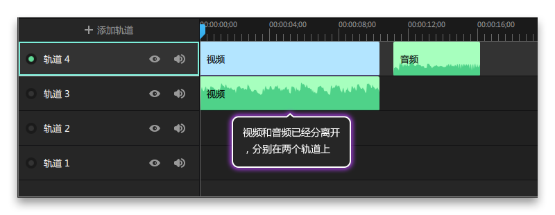 3、可以看到,视频和音频已经分离开,分别在两个轨道上,可以分别进行剪辑,如图3所示。