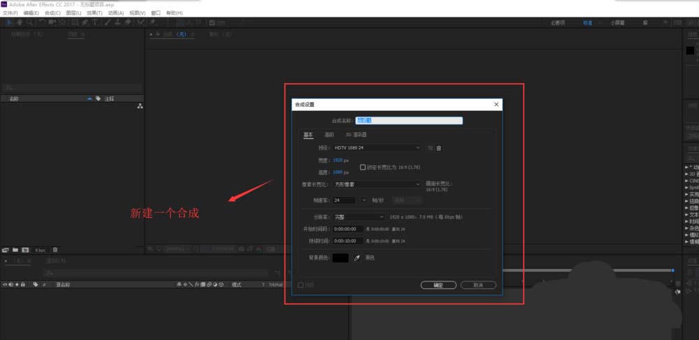 1、在AE中单击项目窗口下方的新建合成按钮,弹出合成设置窗口,设置该合成的相关参数,点击确定创建一个合成。