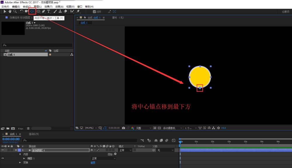 3、找到并切换到工具组中的锚点工具,选中绘制的正圆,将这个圆的锚点移动到圆的正下方位置上。