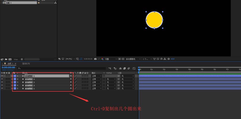 4、选中形状图层1,直接按快捷键Ctrl+D执行复制操作,多按几次得到多个相同的正圆形状图层。