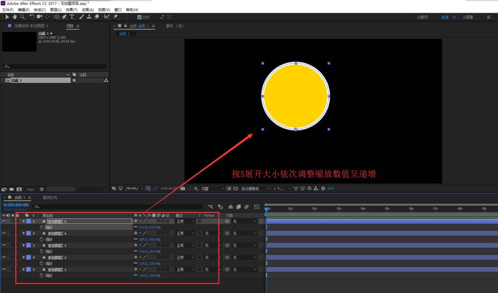 5、选中所有形状图层,按S展开缩放效果设置,依次设置缩放百分比数值,让这个圆呈递增的百分比缩放。