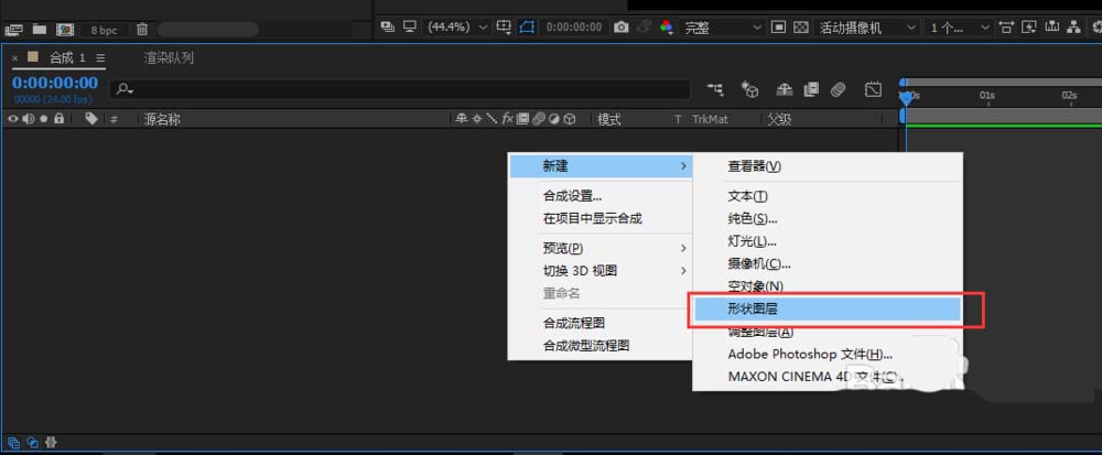 2、在该合成的图层管理窗口处右键鼠标,弹出右键鼠标选项,选择并执行新建中的形状图层,创建一个形状图层出来。