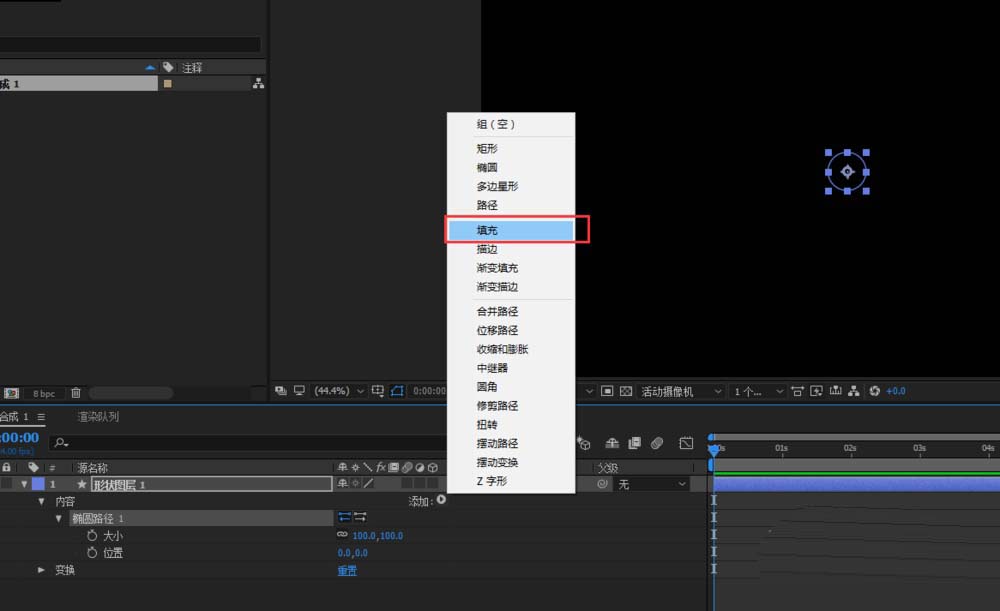 4、上一步创建的椭圆是无填充的,所以我们再次点开添加,在添加中找到“填充”,单击填充为当前的圆设置一个填充颜色。
