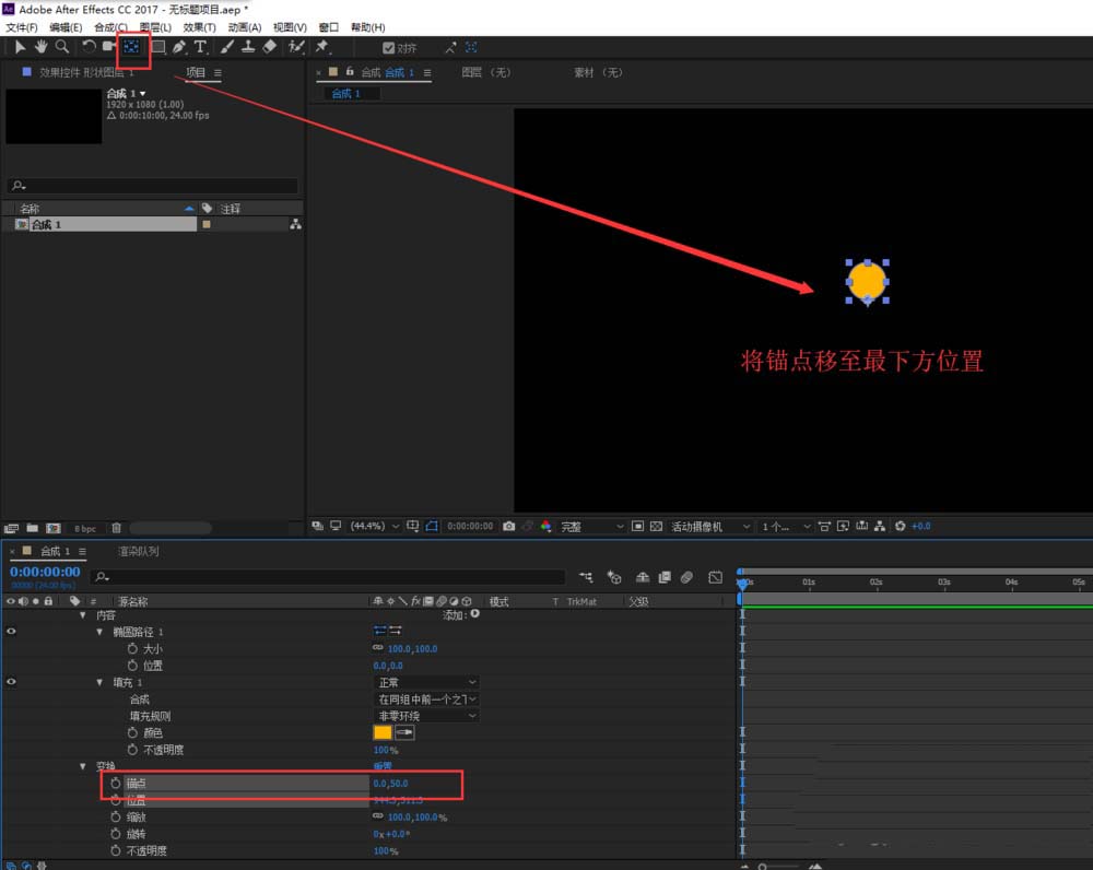 5、选中这个圆的图形,找到“向后平移锚点工具”,将圆的锚点由中心点移动到圆图形的最下方的位置上。