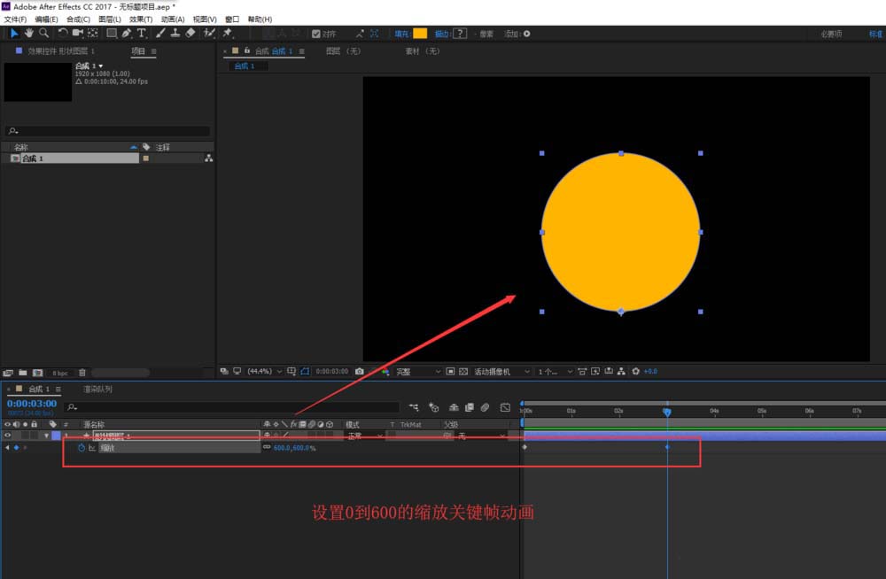 6、选中图层按S展开缩放动画设置,在开始的时候打入第一个关键帧,设置缩放数值为0;然后隔3秒的时间,设置缩放为600%并生成第二个关键帧。播放预览,一个从一点缩放出现的圆动画就出现了。