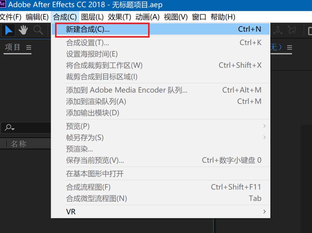 1、首先点击菜单栏里的合成,然后选择新建合成。
