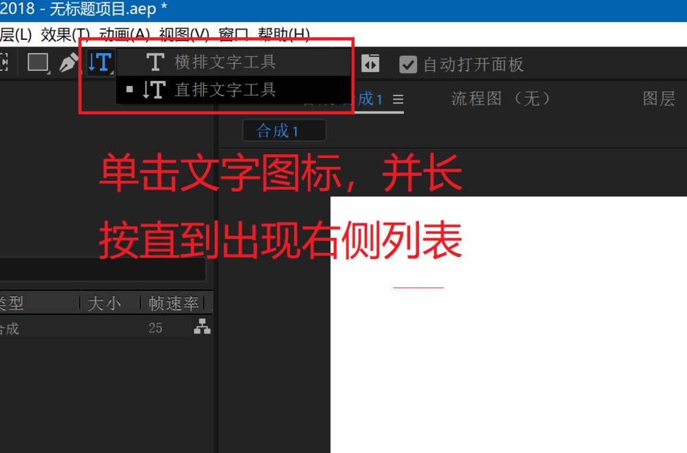 3、然后点击T字形的图标,并长按,一直到出现下图红框中所示的列表。选择其中的直排文字工具。