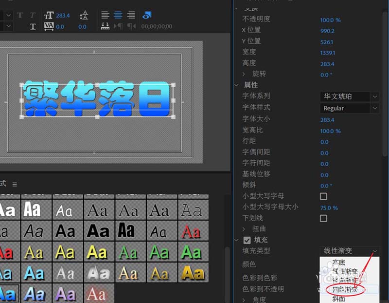 7、找到右侧的旧标题属性面板,将填充类型勾选并将其更改为:四色渐变。