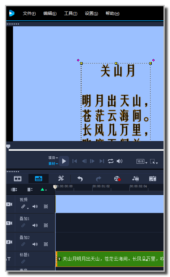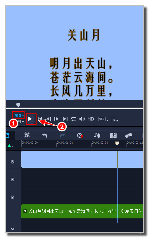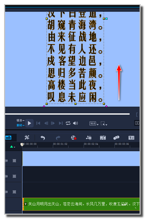 5、点击时间轨上面的项目后点击播放就可以看到整篇文字从下向上滚动的效果了。