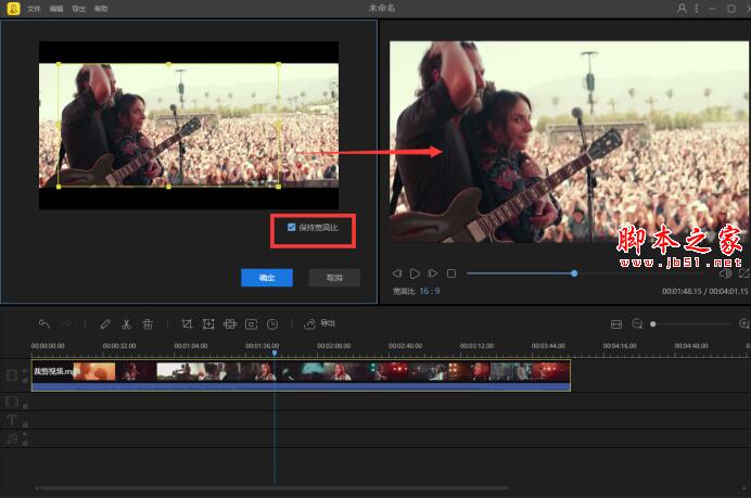 5、在裁剪窗口中勾选“保持宽高比一致”,防止裁剪后还是出现黑边。然后缩小黄色的边框至预览窗口中不再出现黑边。