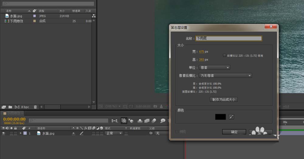 2、CTRL+Y新建一个固态层,颜色随意,大小默认跟合成大小一样,并命名为降雨层