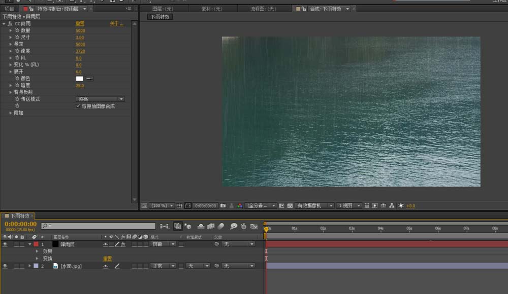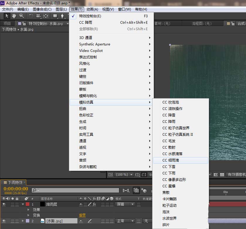5、选中水面图层,给水面图层添加cc细雨滴特效,效果-模拟仿真-cc细雨滴,并调整对应数值,同理边观察边调节对应的数值,尽量做到逼真自然。