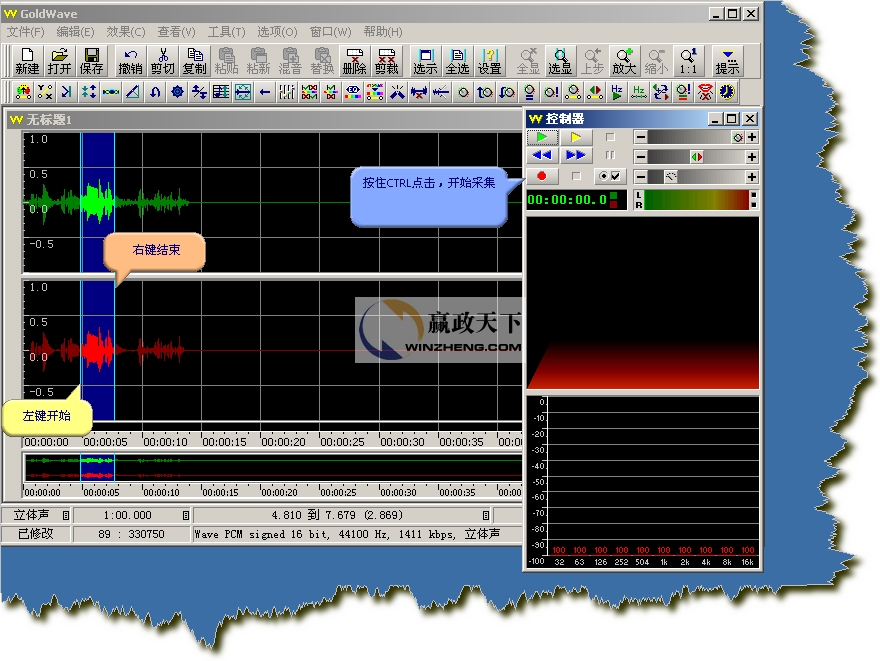 录制完一段声音后,可以选定一部分进行编辑,方法是,鼠标左键确定开始点,鼠标右键确定终点~