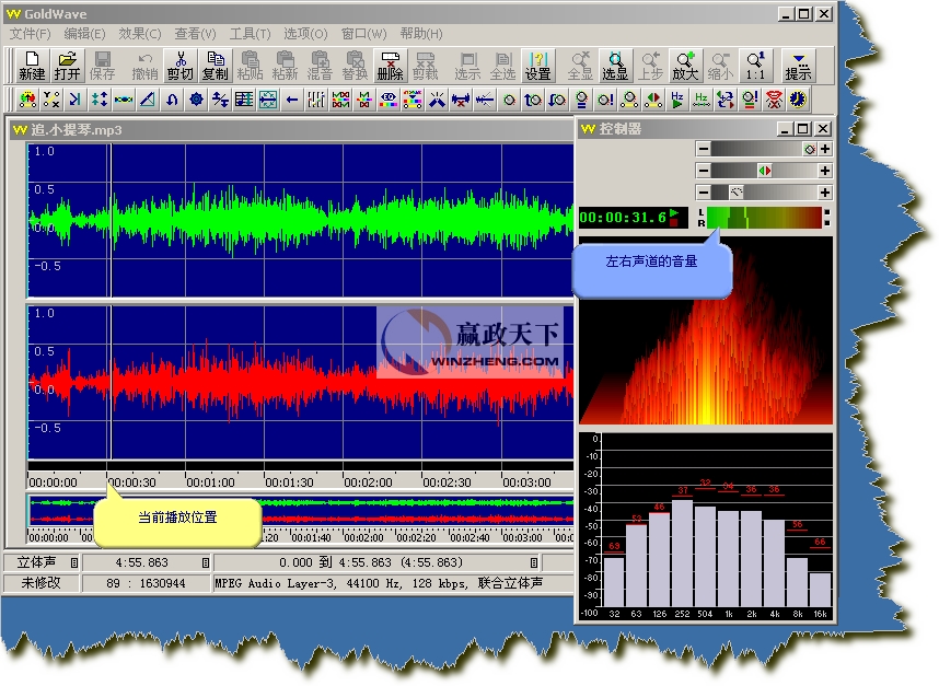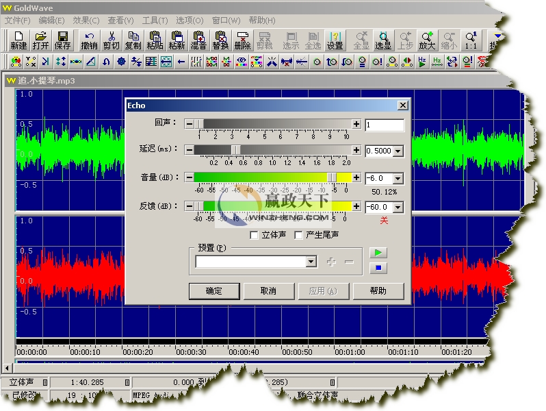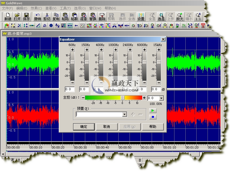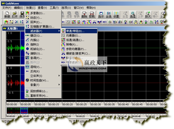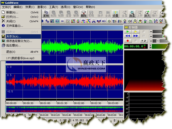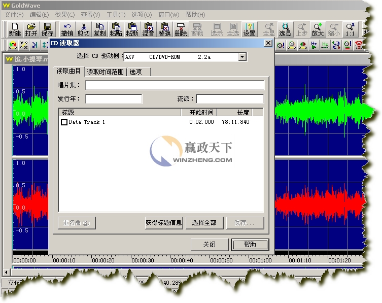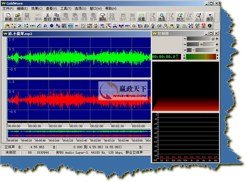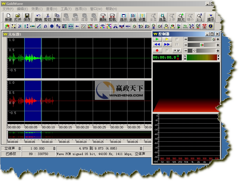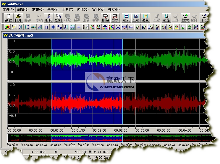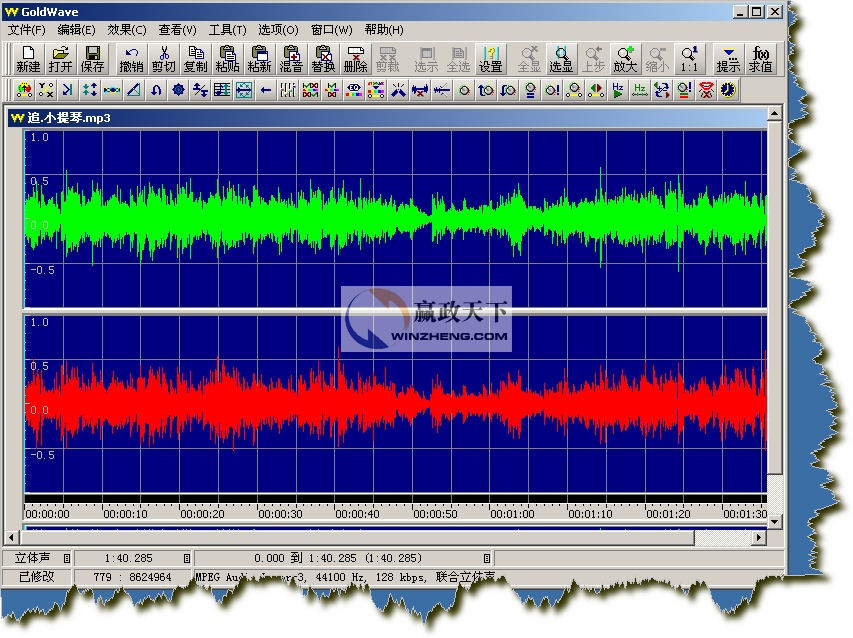 我们打开的是一个立体声文件,所以GoldWave会分别显示两个声道的波形,绿色部分代表左声道,红色部分代表右声道