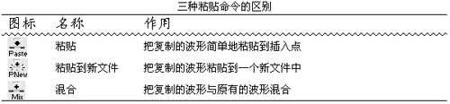刚才我们使用的粘贴是普通的粘贴命令,除此之外,在GoldWave的工具栏的第一行中还有粘贴到新文件以及混合这两种特殊的粘贴命令。三种粘贴命令的区别如图9所示。
