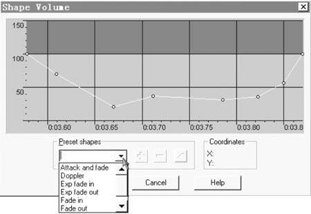这些按钮的使用方法很类似,按下按钮后,就会弹出一个窗口,只要调节各个参数就可以完成对声音的处理,我们就不一一详述了。但是,有些按钮却需要你用图形的方式来调节参数。下面我们来重点介绍这部分,以形状按钮为例来说明。