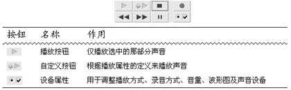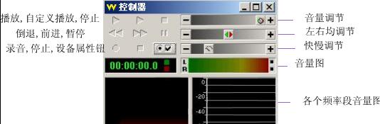 在播放波形文件的过程中可以随时暂停、停止、倒放、快放播放进度,使用方法与普通的录音机一样。在设备控制面板上还有一个录音按钮,你可以用它录制自己的声音,甚至可以把自己的声音录制到一个已有的声音文件中与原有的声音混合,或者把原有的声音覆盖。也可以在设备控制面板上调整音量、左右均衡和播放速度。