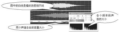 播放波形文件的时候,在GoldWave窗口中会看到一条白色的指示线,指示线的位置表示正在播放的波形。与此同时,在设备控制面板上会看到音量显示以及各个频率段的声音的音量大小,参见图4