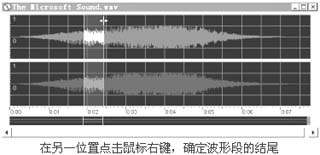 这样,我们就选择了一段波形,选中的波形以较亮的颜色并配以蓝色底色显示,如图9所示;未选中的波形以较淡的颜色并配以黑色底色显示。现在,我们可以对这段波形进行各种各样的处理了。