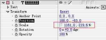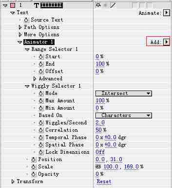 添加Porperty>Scale和Opacity属性,Selector>Range和Wiggly属性,参数如图。