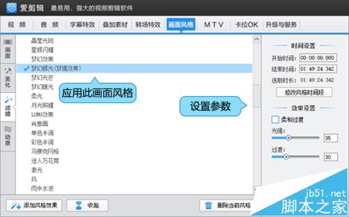 通过“画面风格”中的“梦幻辉光”、“梦幻光芒”或“曝光”实现闪白效果
